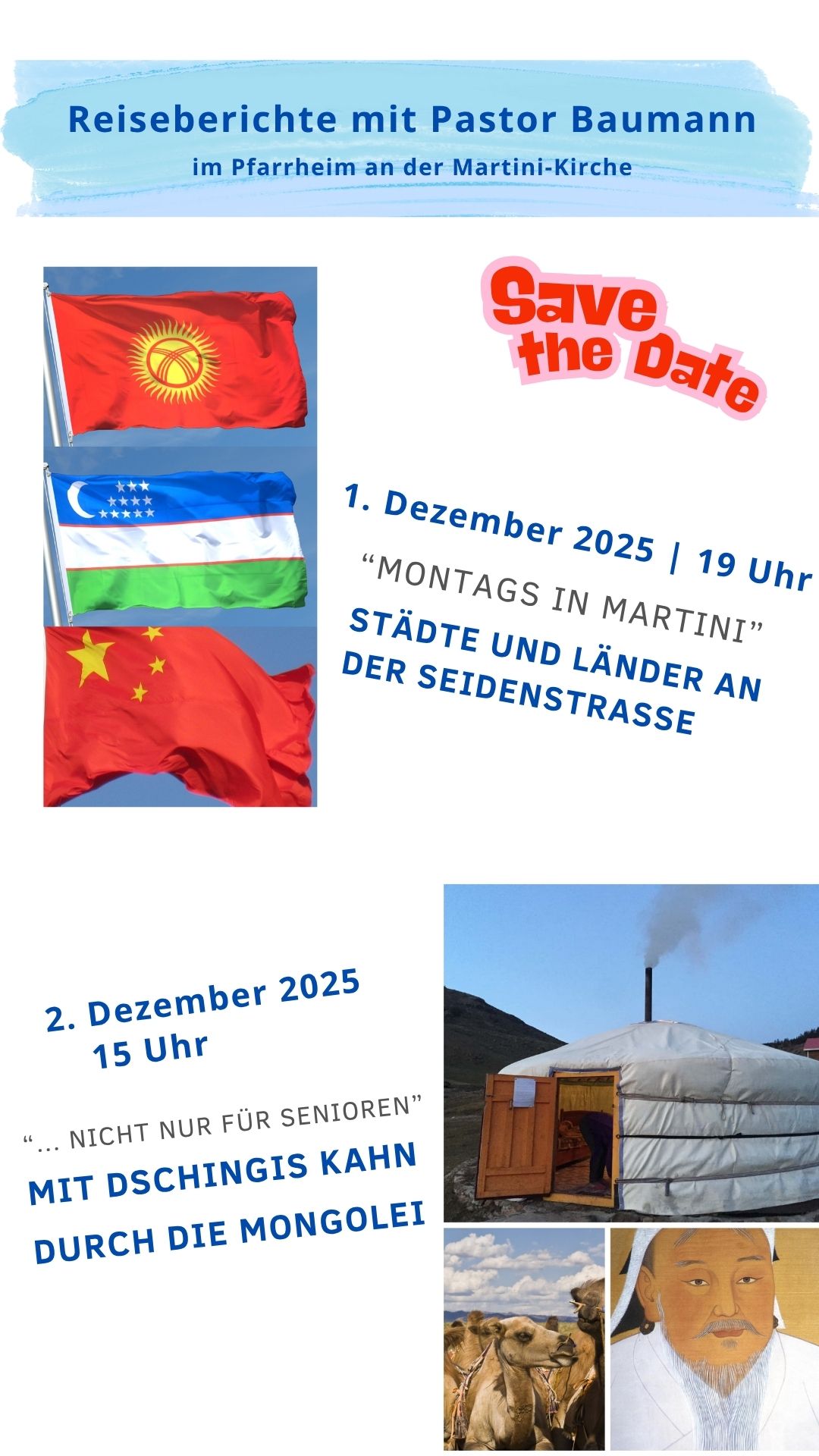 Herzliche Einladung sich auf die Reise zu begeben. Am 1. Dezember stehen Städte und Länder an der Seidenstrasse auf dem Programm. Am 2. Dezember geht es dann mit Dschingis Kahn durch die Mongolei.