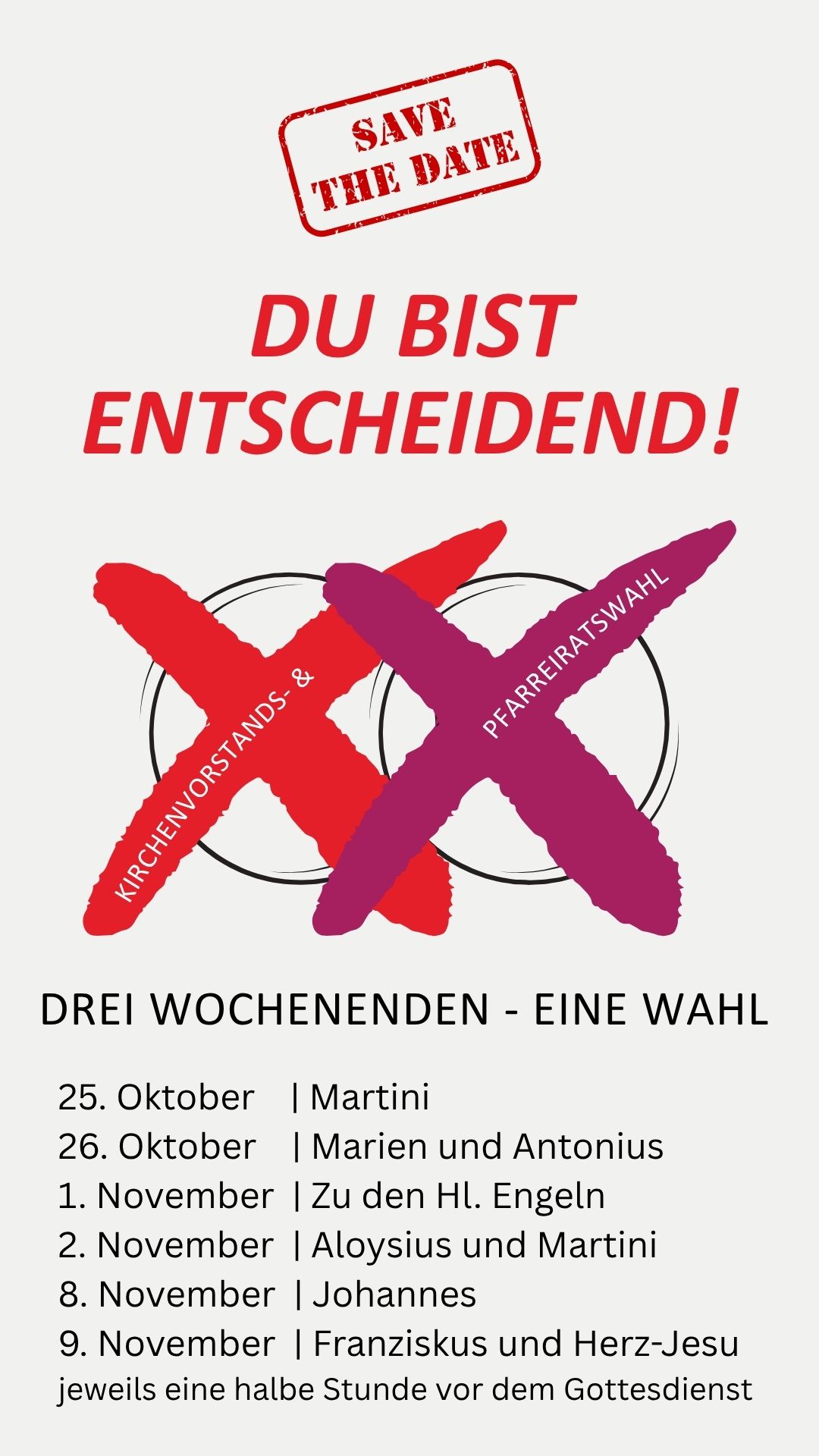Vom 27. Oktober bis zum 7. November 2025 kann während der Öffnungszeiten des Pfarrbüros ebenfalls gewählt werden. Briefwahlunterlagen können ab dem 25. Oktober über das Pfarrbüro angefordert werden.