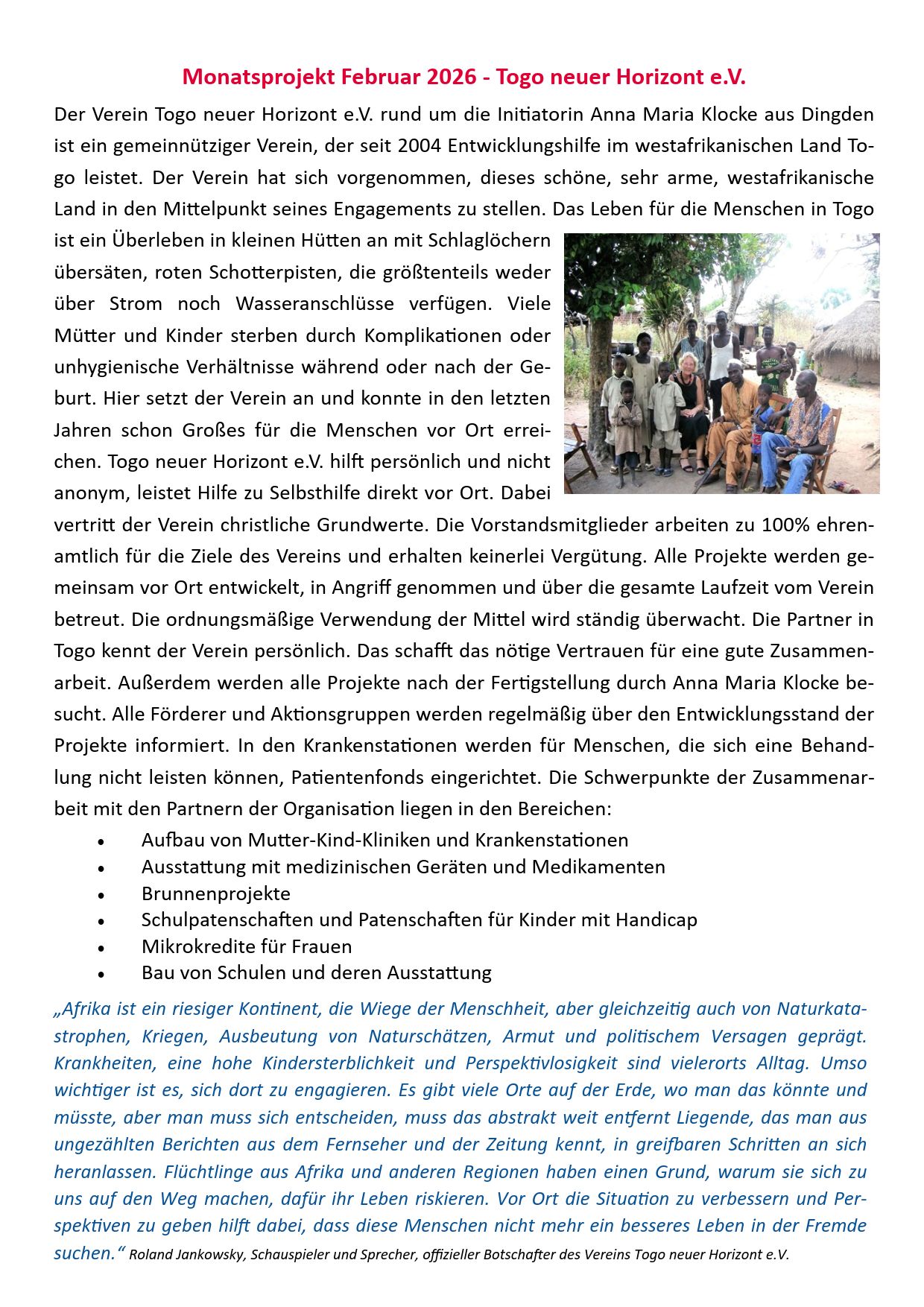 - Einmal im Monat wird Kollekte für das jeweilige Projekt gehalten. Der Termin wird im Newsletter bekannt gegeben.