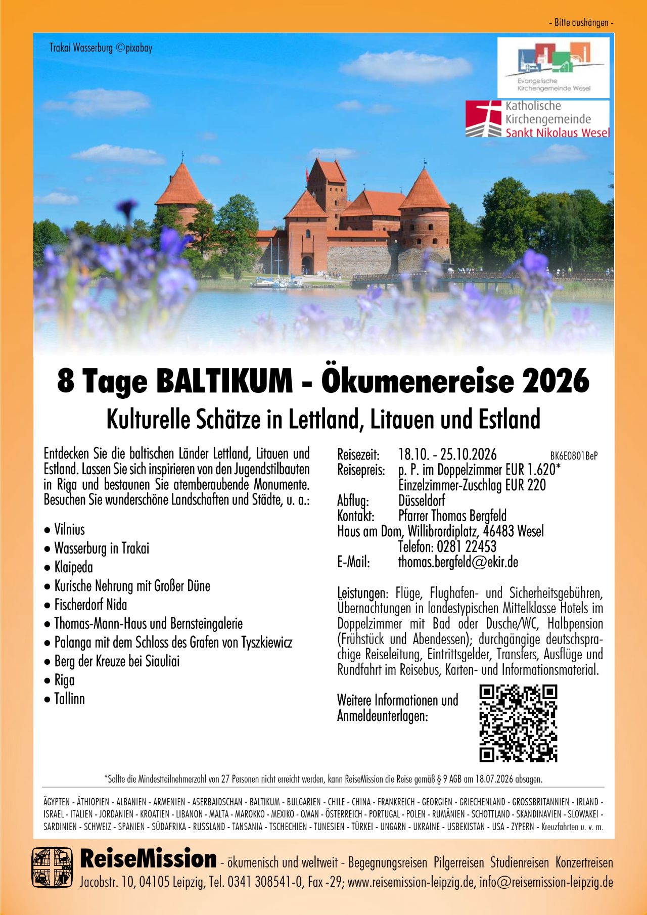 3. Tag: Fahrt mit der Fähre zur Kurischen Nehrung, Spaziergang zur Großen Düne und danach im Fischerdorf Nida Gang u. a. zur BacIhre Anmeldung senden Sie bitte bis spätestens 18.06.2026 an Pfarrer Thomas Bergfeld, Haus am Dom, Willibrordiplatz 10, 46483 Wesel, Telefon: 0281 22453, E-Mail: thomas.bergfeld@ekir.de