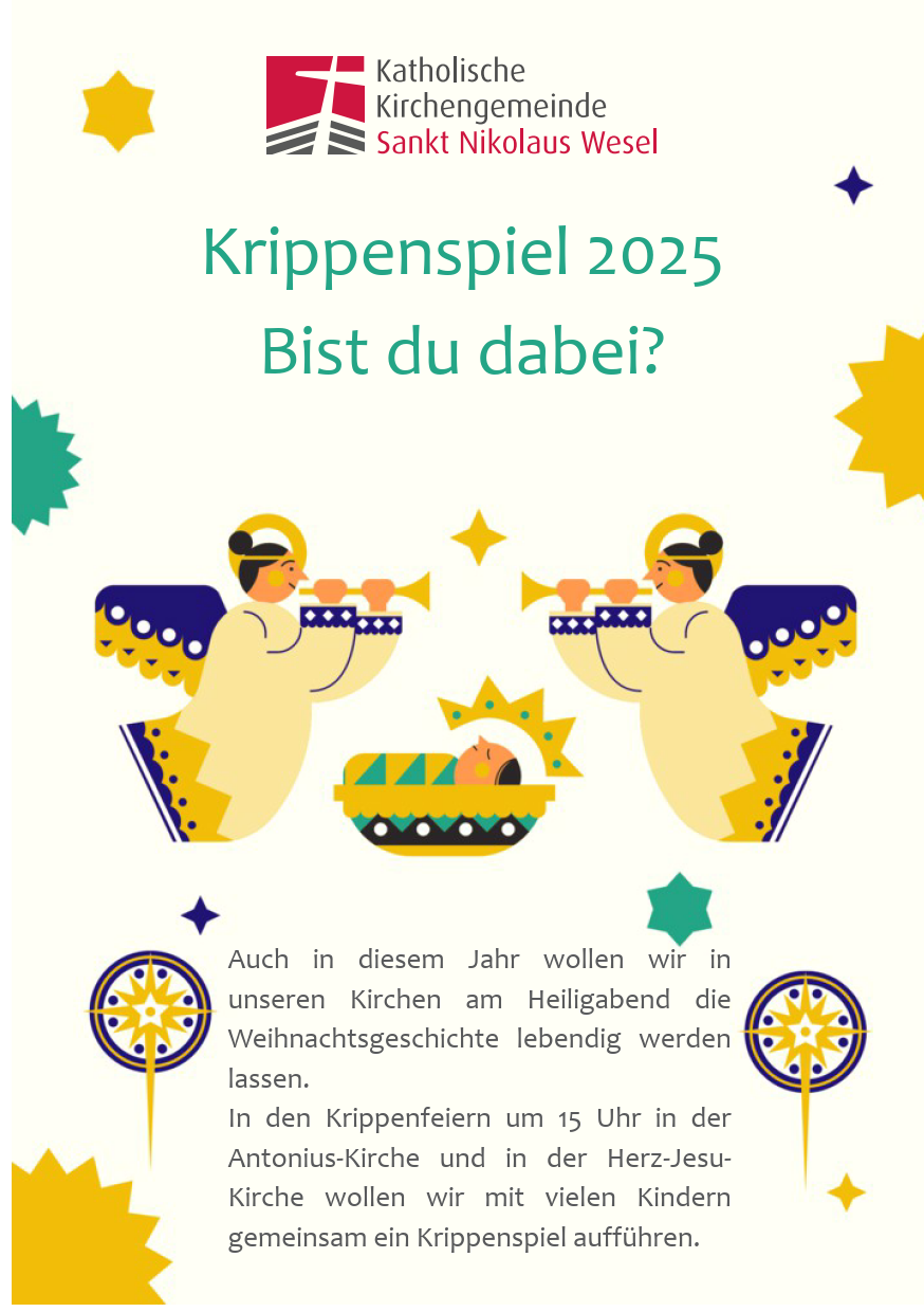 Auch in diesem Jahr wollen wir am Heiligabend in der Herz-Jesu-Kirche und in der Antonius-Kirche die Weihnachtsgeschichte im Krippenspiel lebendig werden lassen.