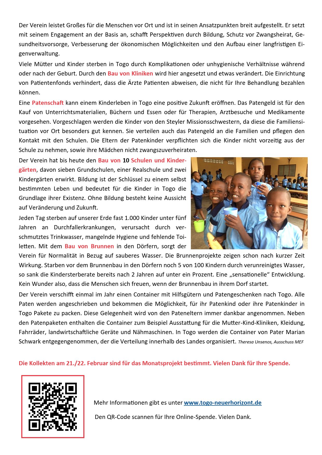 - Einmal im Monat wird Kollekte für das jeweilige Projekt gehalten. Der Termin wird im Newsletter bekannt gegeben.